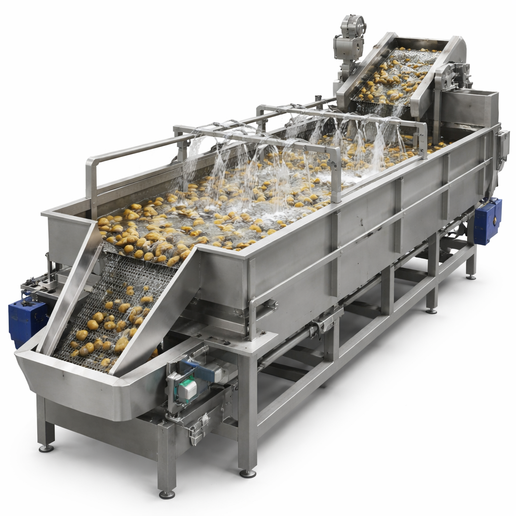 The washing machine removes soil, stones, and foreign particles from potatoes before processing.